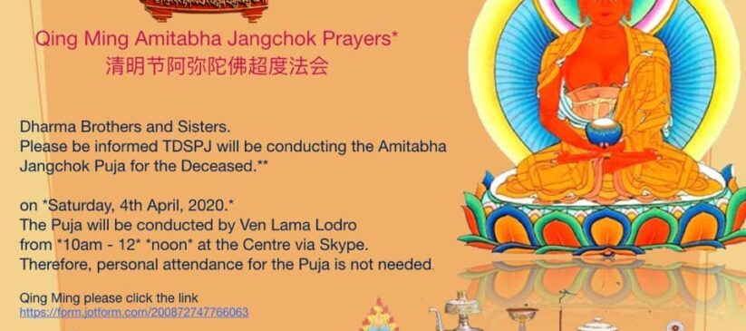 Please be informed TDSPJ will be conducting the Amitabha Jangchuk Puja on *Saturday, 4th April, 2020.* The Puja will be conducted by Ven Lama Lodro from *10am – 12* *noon* at the Centre via Skype. Therefore, personal attendance for the Puja is not needed.
